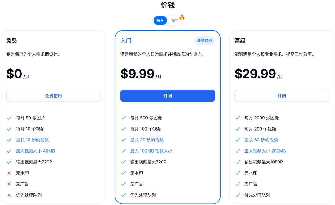 初级计划:每月 9.99 美元,每月可生成生成 500 张图片、100 个视频、视频时长最长 30 秒且无水印;