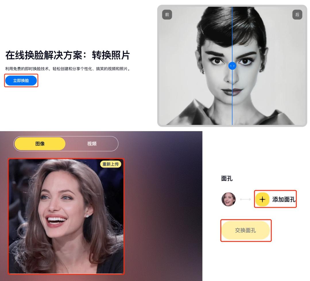 首先,打开 Faceswap 官网,点击「立即换脸」按钮,再上传一张待换脸的照片,然后点击「添加面孔」,继续上传一张照片,最后点击「交换面孔」,换脸完成。