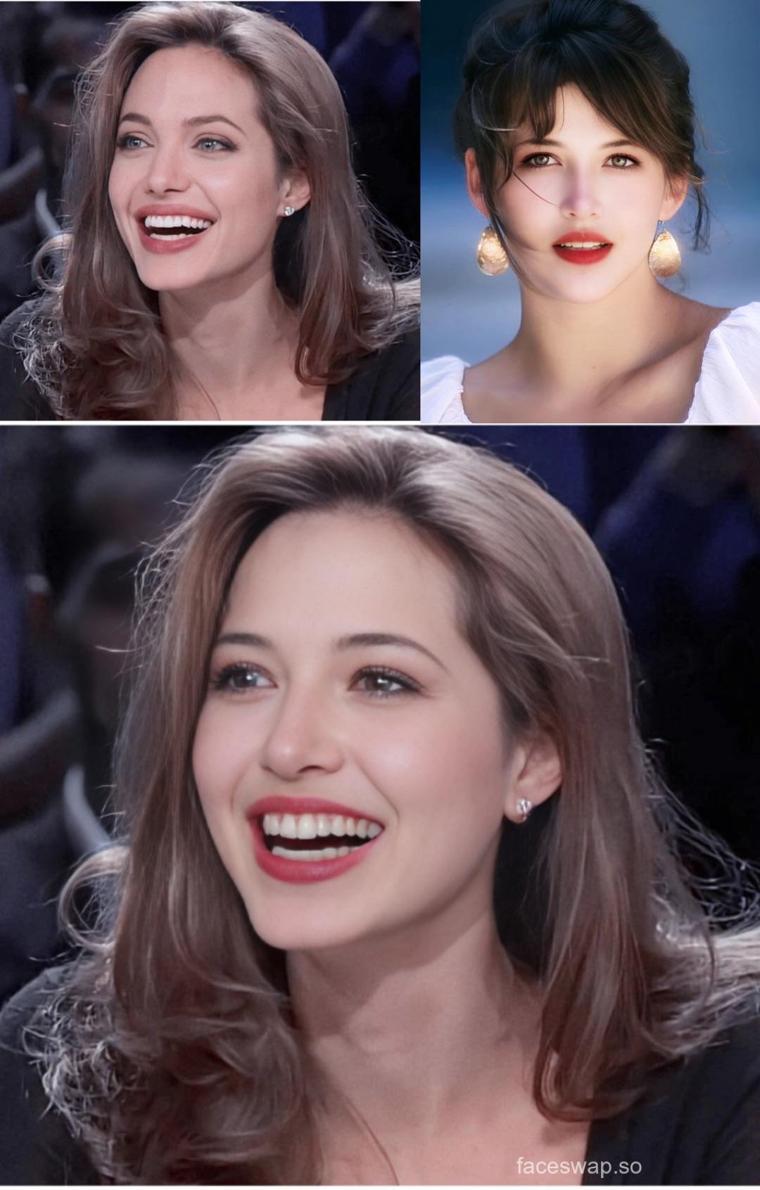 例如,我们先后上传了一张「大嘴姑婆」安吉丽娜・朱莉(左上图)和「法兰西玫瑰」苏菲・玛索(右上图)的照片,最终换脸效果(下图)如下: