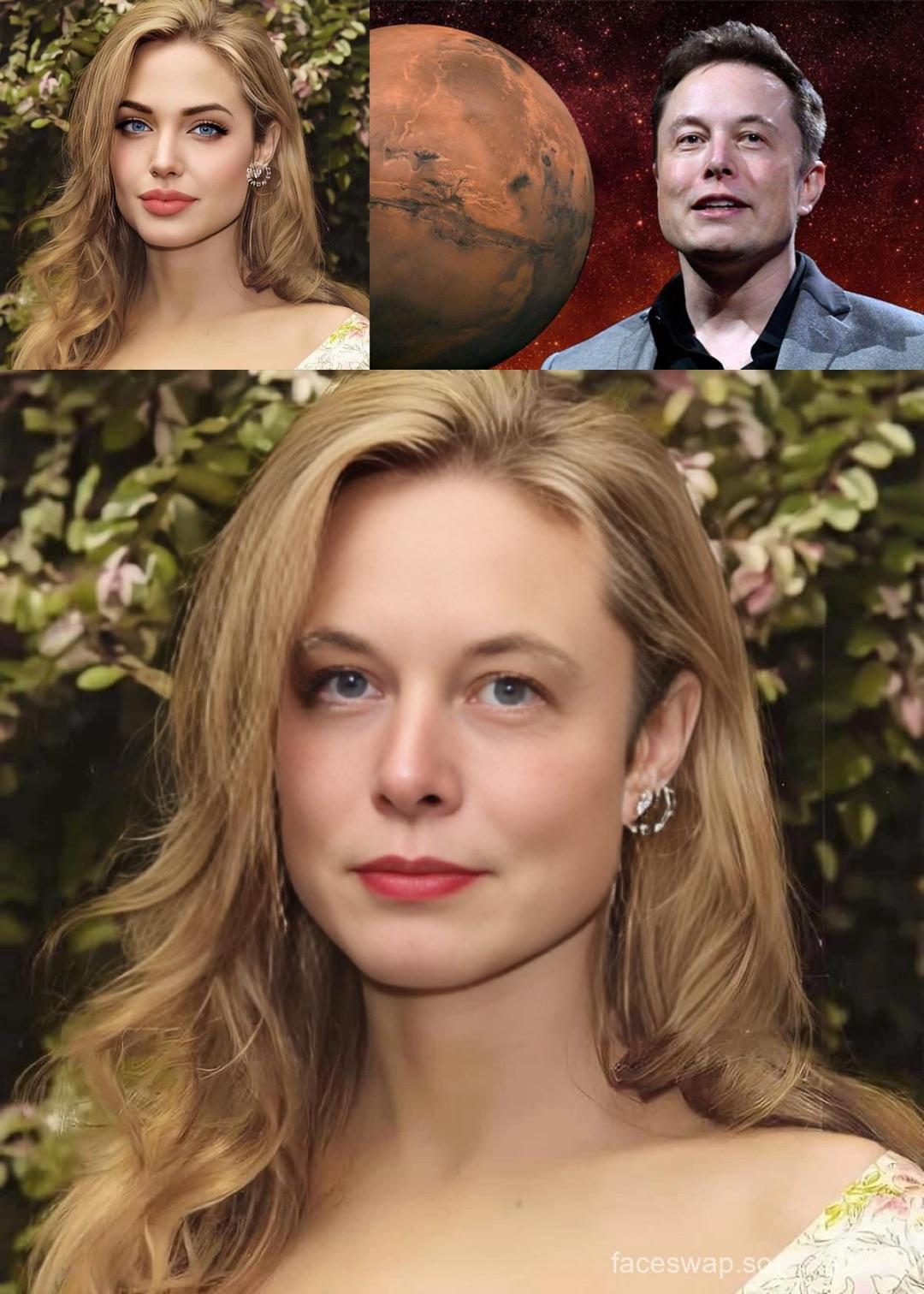 我们再生成一张朱莉和马斯克的换脸照片,其换脸效果更加明显,眉眼和嘴巴都有马斯克的影子。(女版马斯克还挺风情万种~)