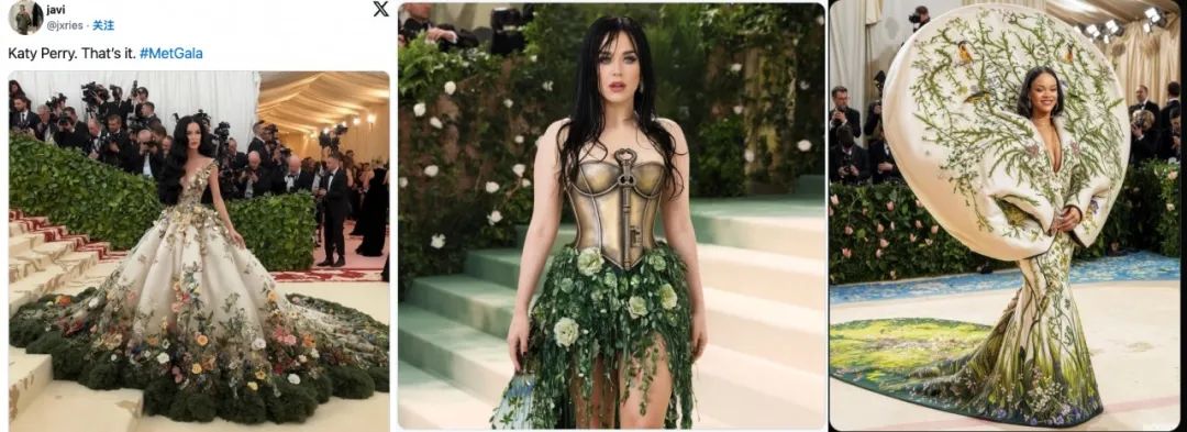 前几天的 Met Gala 红毯上,凯蒂・佩里和蕾哈娜明明未现身,但 AI 生成的红毯照满天飞,如果不细看很难找出破绽。(以下照片均为 AI 生成)