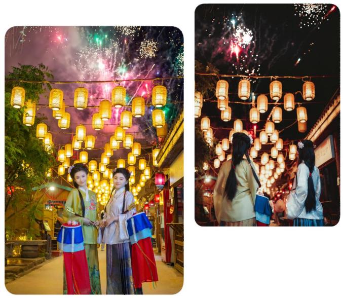 为了更好的打卡烟花,我们选择了黑风关演出背面的街坊作为打卡点摆好角度和机位,烟花大片轻松到手摄影师推荐:虽然佳人配合天上的烟花超出片,但是这个街坊的人也不少,一定要注意安全。
