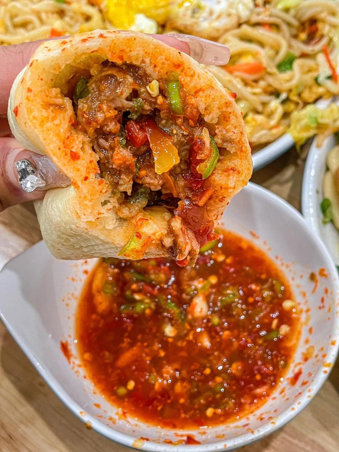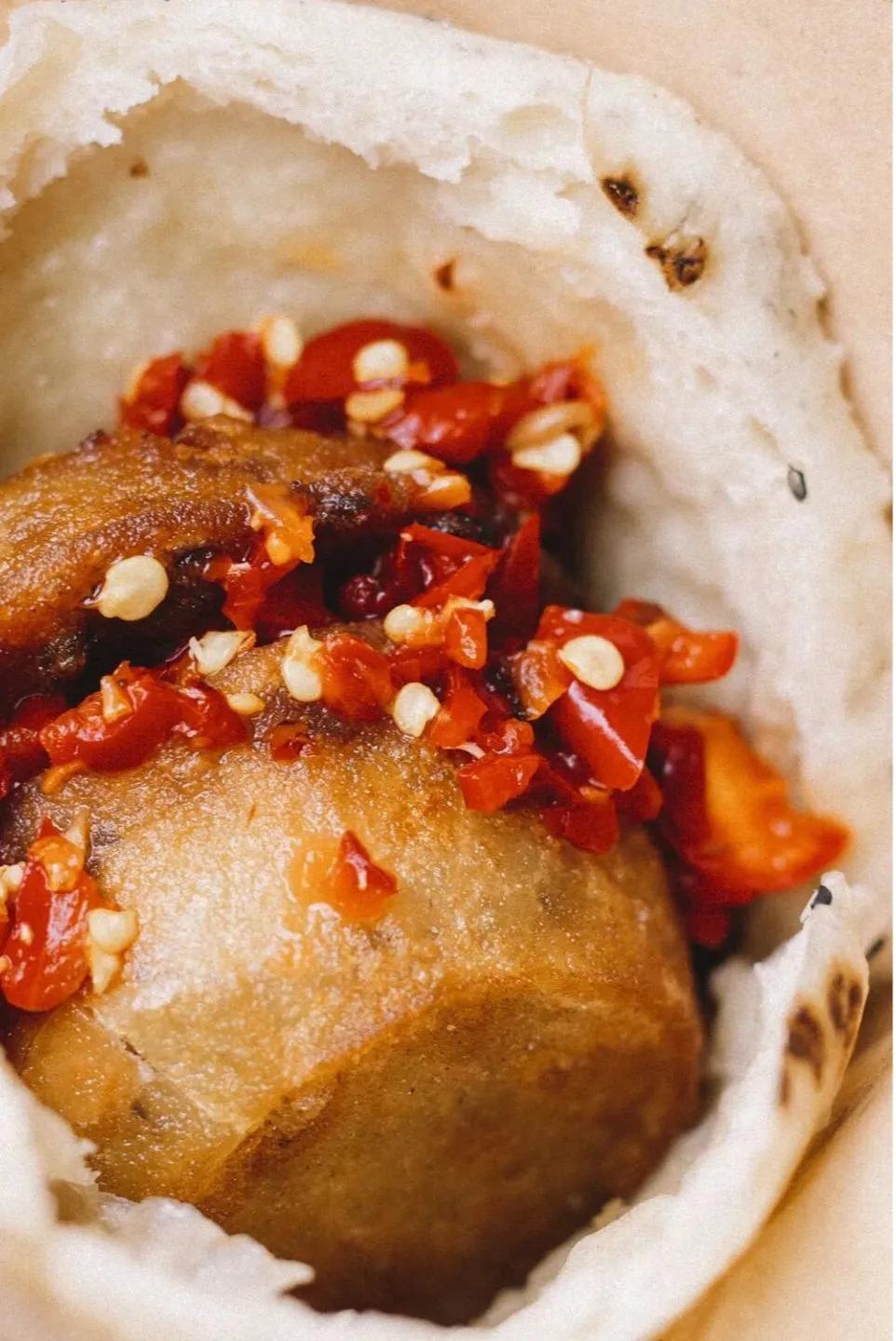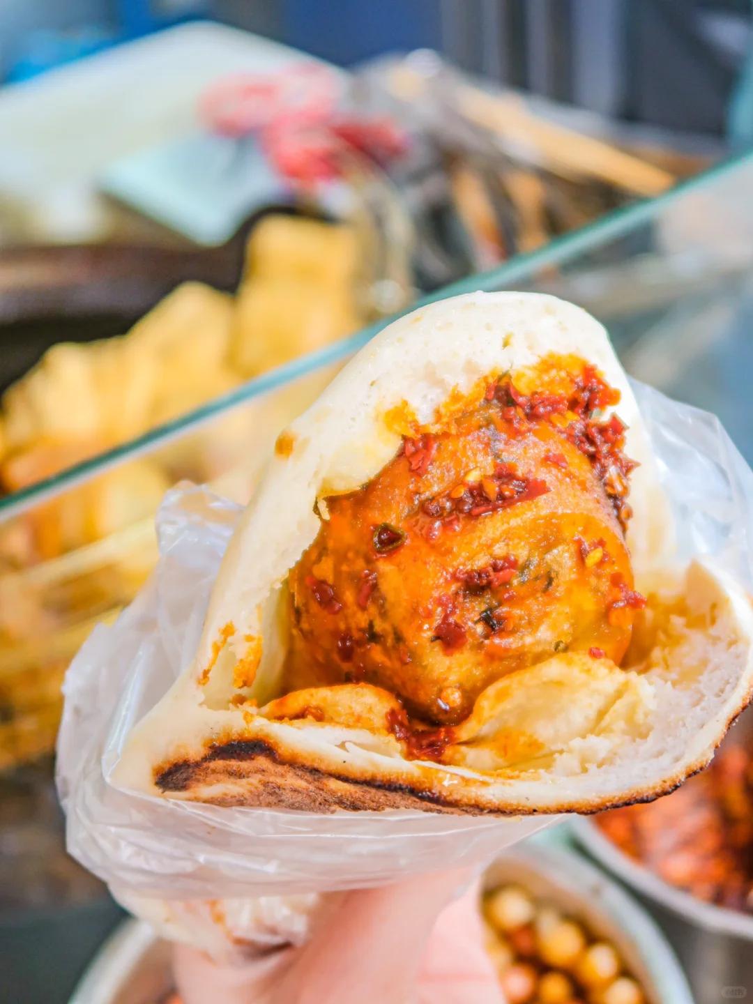 等烤到香气四溢后从中间剪开,夹进一根热乎酥脆的油条,饱满的肉沫夹杂着秘制辣椒,吃完开心一整天。