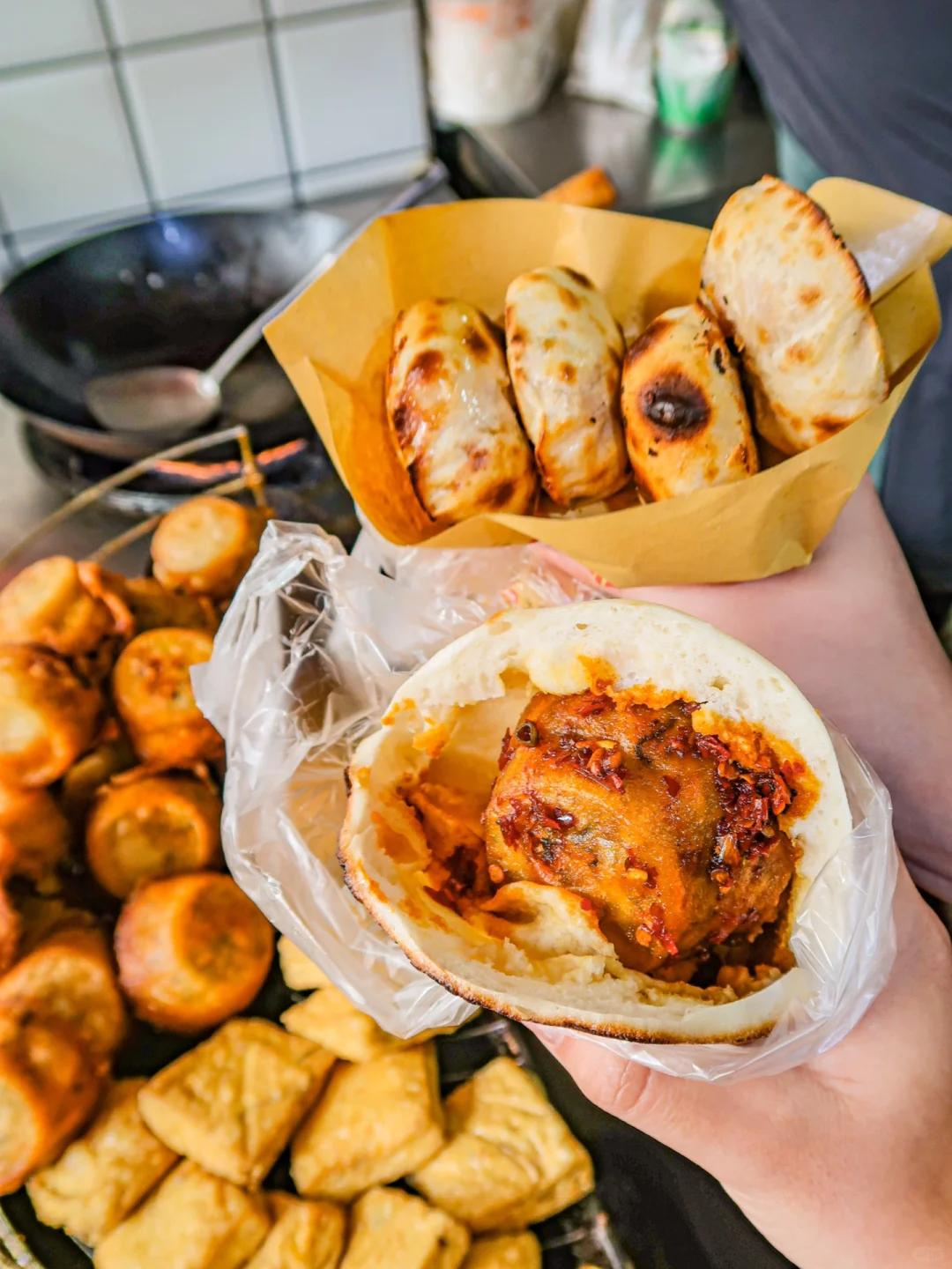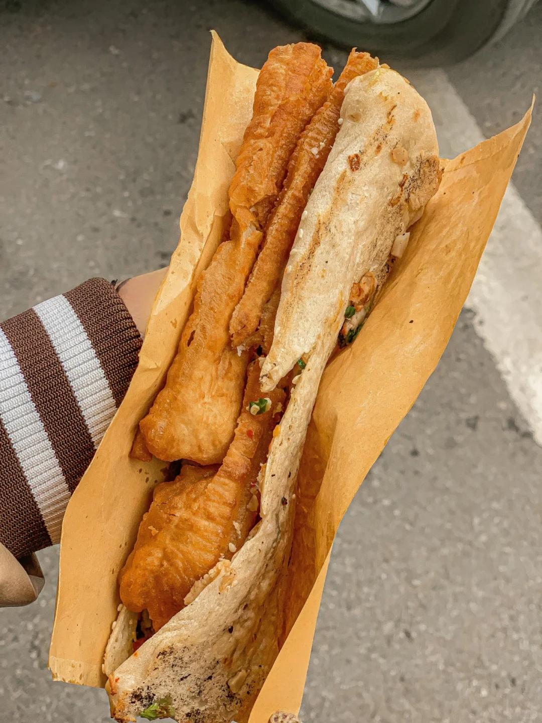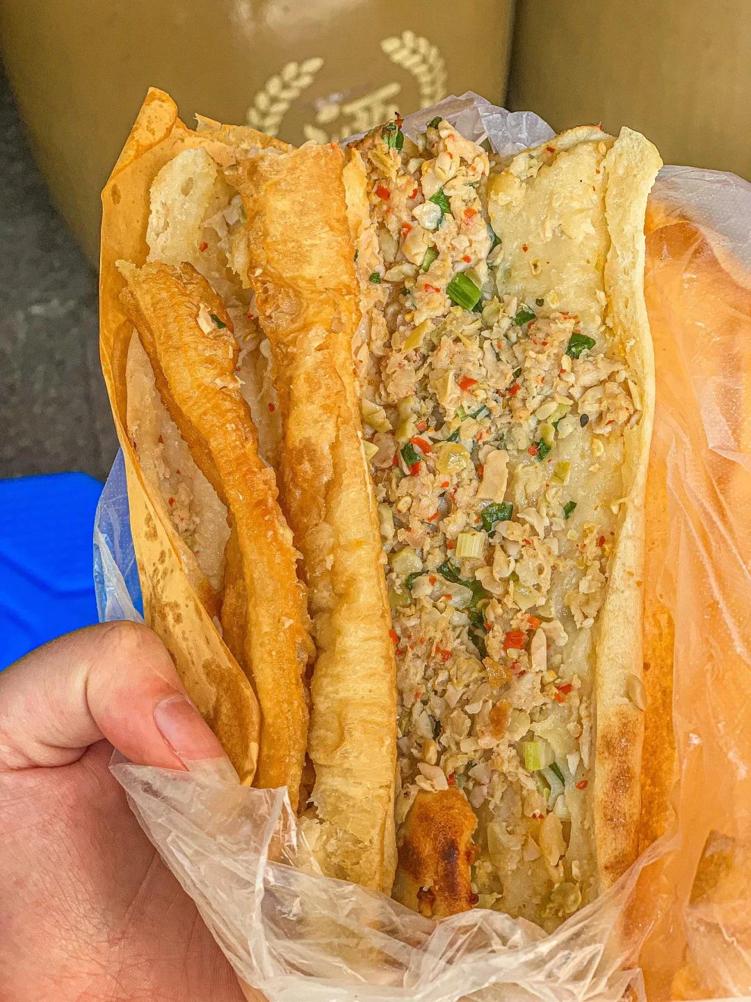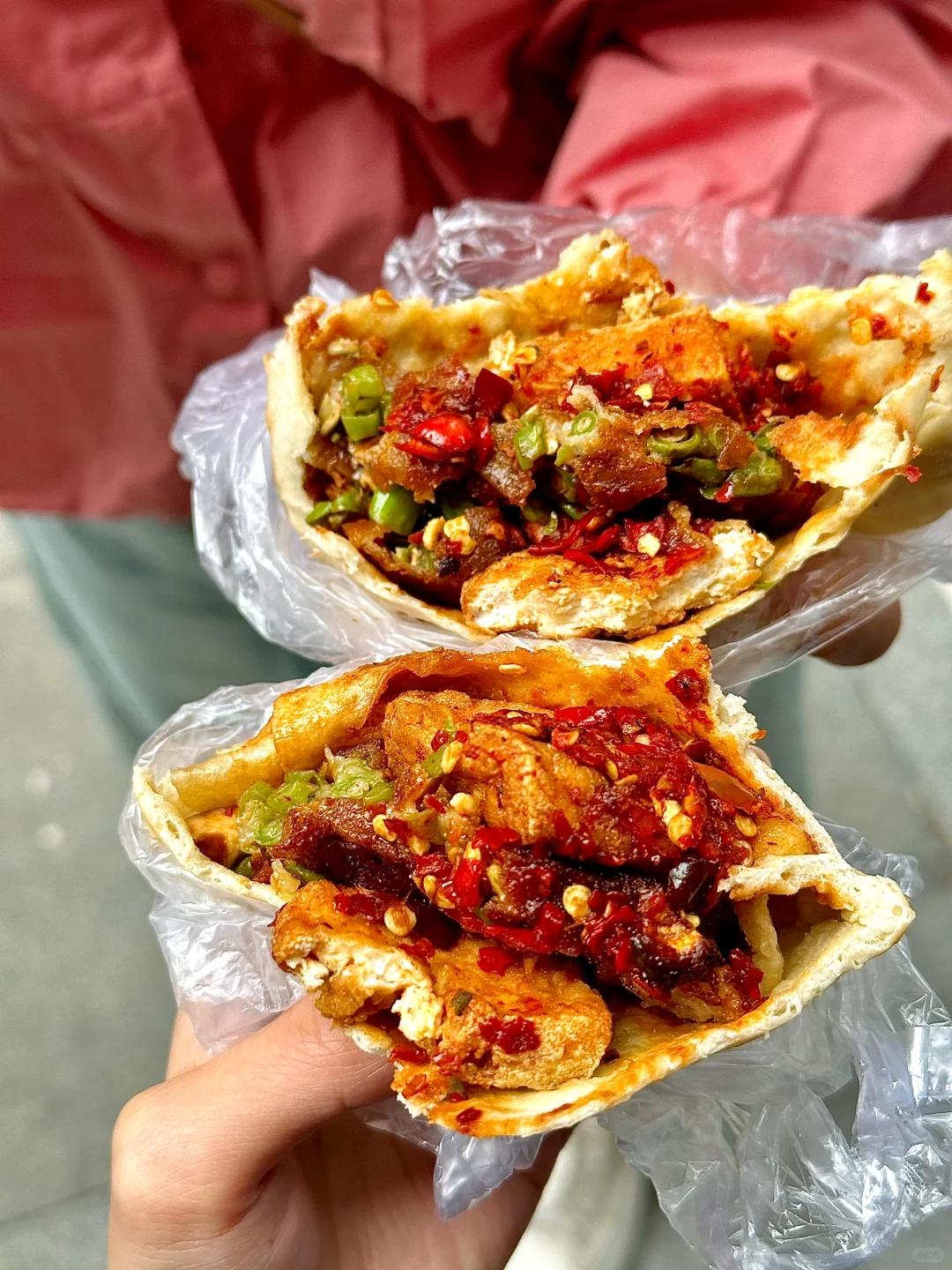 等烤到香气四溢后从中间剪开,夹进一根热乎酥脆的油条,饱满的肉沫夹杂着秘制辣椒,吃完开心一整天。