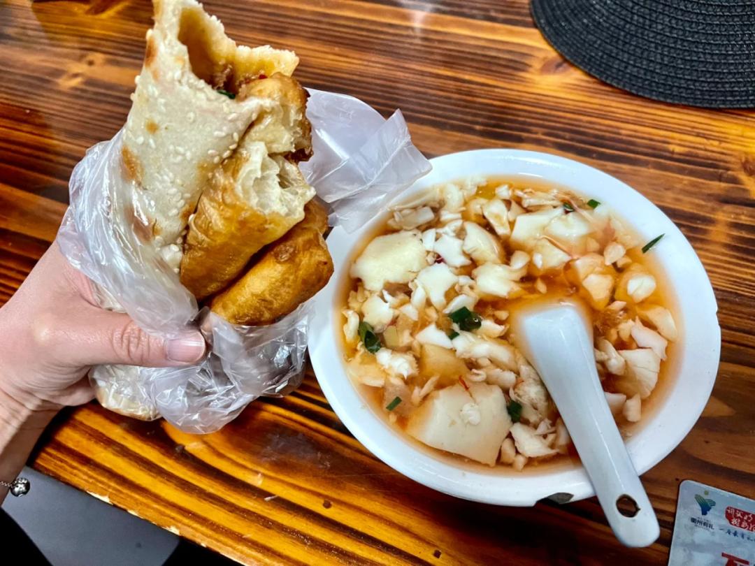 一家拥有10年资历的老店,每天5:30就开始营业,3块钱的搁袋饼+2块钱的油条,再来一碗2块钱的咸味豆花,就是一整个大满足。