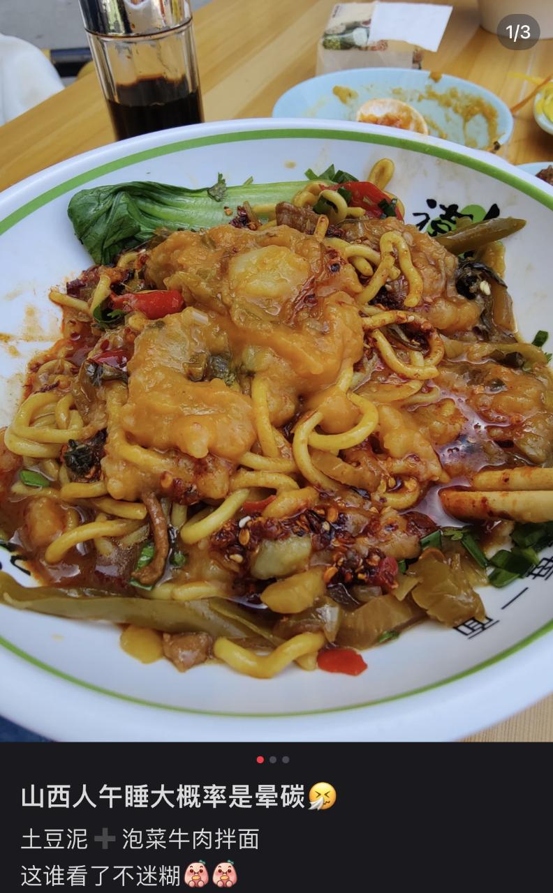 图源@蟹黄堡不过,即便山西人在家真感到了无聊,他们也有自创的“快乐土方”,即每天中午都摄入大量的碳水,然后开始美美午睡。