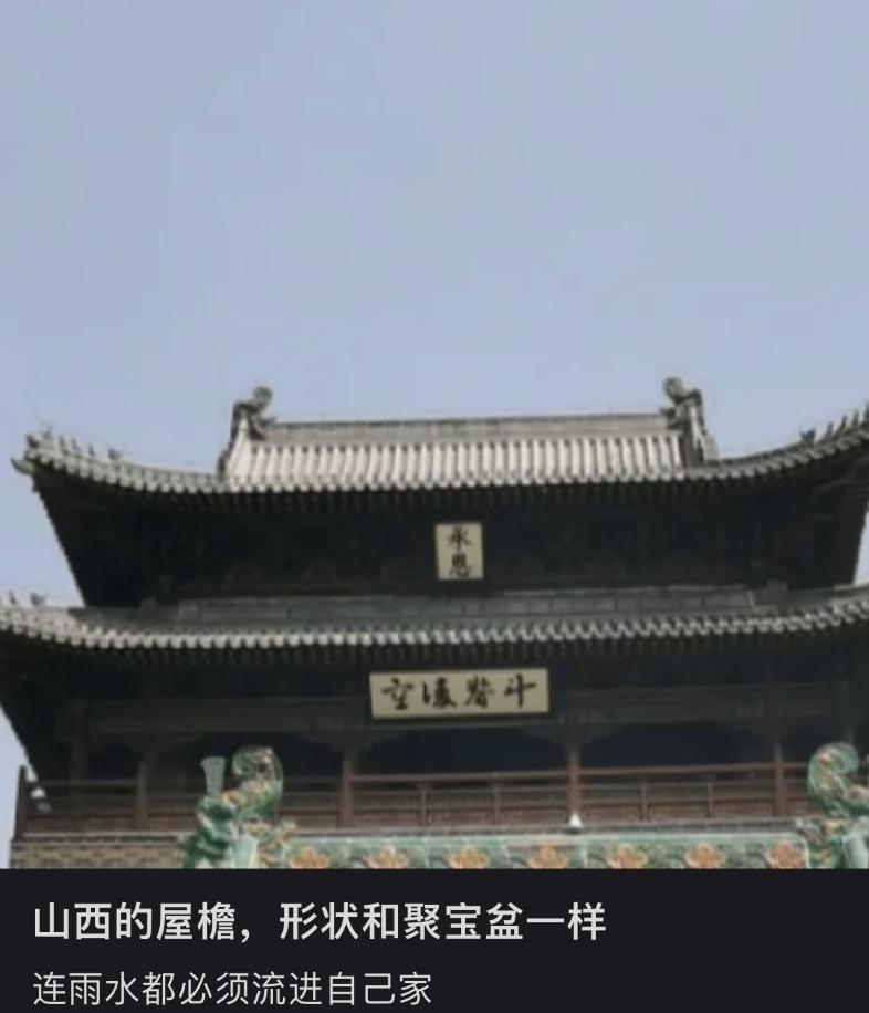图源@菠萝大大头家是山西人的诺亚方舟,所以他们愿意穷尽一切所能,让自己家能变得更充实,甚至就连他们房顶上的瓦片,都会设计成能让雨水往院内流的造型,寓意“肥水不流外人田”。