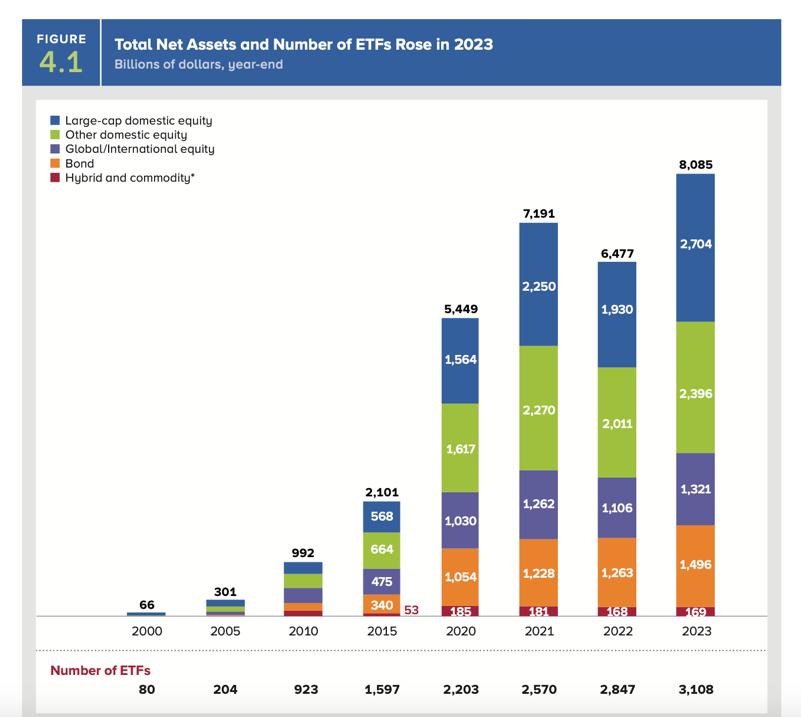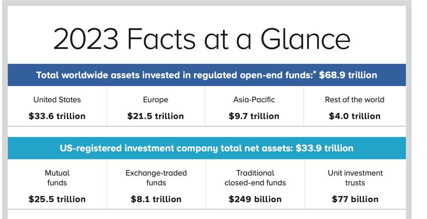 一年增加8.8万亿美元截至2023年底,美国受监管的基金总净资产(也即美国注册投资公司总净资产)为33.9万亿美元,包括共同基金,规模为25.5万亿美元;ETF,规模为8.1万亿美元;传统封闭式基金,规模为2490亿美元;单位投资信托,规模为770亿美元。
