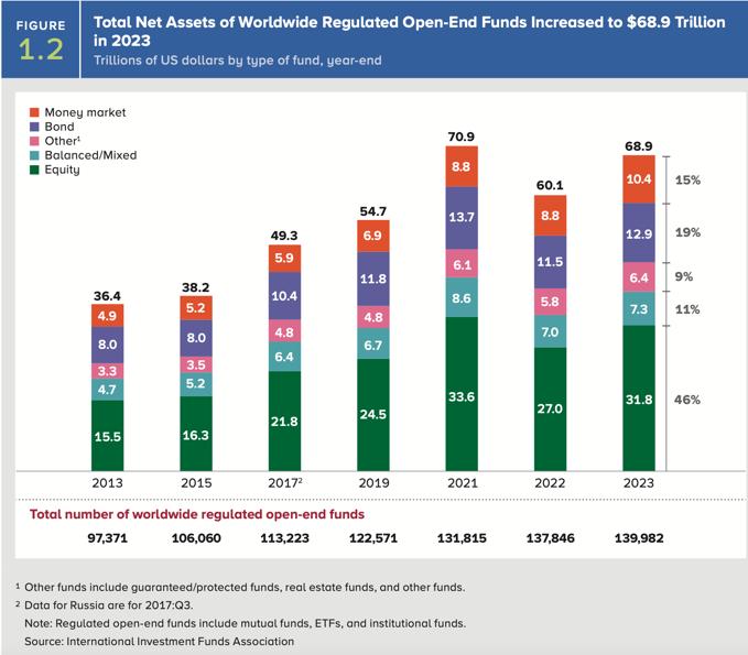 尽管规模反弹,但是68.9万亿美元并非全球受监管的开放式基金的历史最高水平。全球受监管的开放式基金总净资产在2021年底达到70.9万亿美元,创历史新高,较两年前的54.7万亿美元增长16.2万亿美元。在之后的2022年,全球受监管的开放式基金总净资产下降了10.8万亿美元。2023年,全球受监管的开放式基金总净资产又增加了8.8万亿美元,反弹至68.9万亿美元,接近历史最高水平70.9万亿美元。