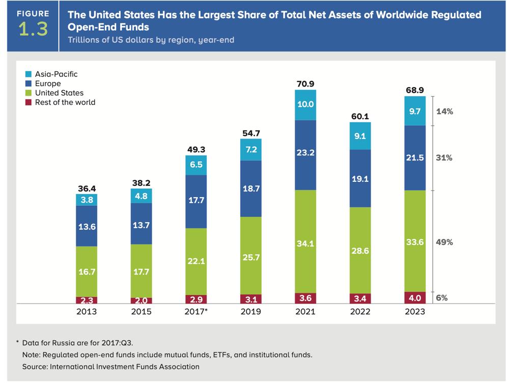日前,美国投资公司协会(ICI)发布的“美国投资公司协会2024年年报(2024 ICI Fact Book)”显示,截至2023年底,全球受监管的开放式基金总规模达68.9万亿美元。其中,美国受监管的开放式基金(含共同基金和ETF)总规模33.6万亿美元,欧洲受监管的开放式基金总规模21.5万亿美元,亚太地区受监管的开放式基金总规模9.7万亿美元。