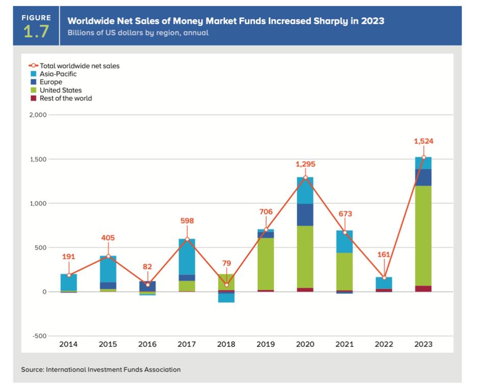 2023年,在美国,机构和零售投资者对货币市场基金的需求高企。2023年,货币市场基金收益率达到了15年以来的最高水平,较高的收益率和较低的利率风险吸引零售投资者和机构投资者。在利率显著波动的背景下,其它资产类别随之显著波动,相形之下货币市场基金吸引力凸显。债基强势吸金