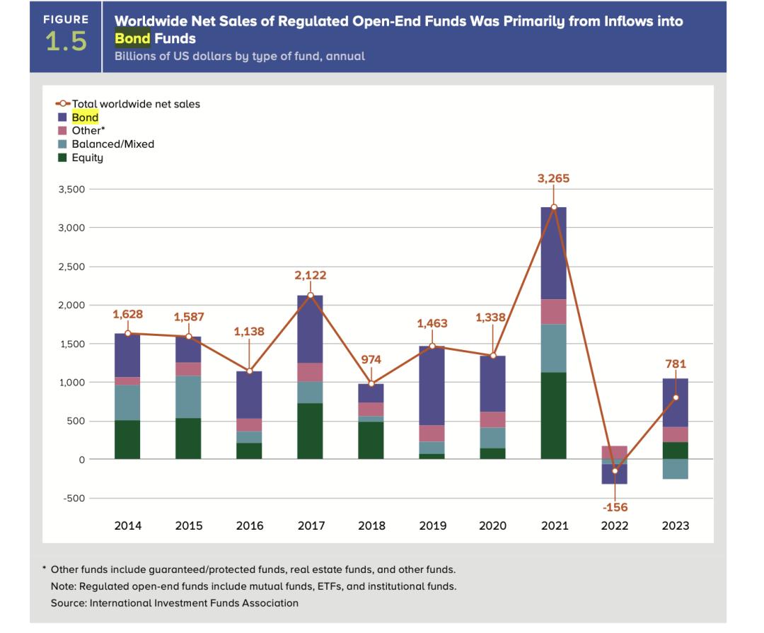 长期限基金内部,2023年,几乎所有类型基金都实现了净销售。例如,全球范围内,股票型基金从2022年净赎回20亿美元转为净申购2180亿美元。这可能与全球股市改善有关。全球范围内,债券基金从2022年的净流出2600亿美元转为2023年净流入6310亿美元。经历了2022年的通胀飙升,央行加息带来的利率升高,2023年下半年全球范围内通胀回落,短端利率企稳。这对债券基金形成利好。一般说来,当利率水平上升时,债券价格下跌。固定收益投资者从利率水平下降中获利。历史数据显示,和股票基金一样,债券基金的净流入情况往往和债券市场的回报相关。