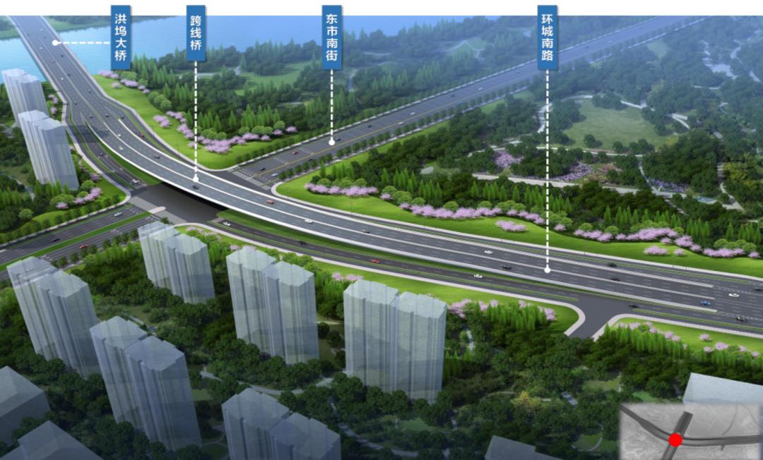 一环二期3标的(跨东市南街)效果图据了解,一环(二期)标段3位于环城南路(洪坞大桥东侧至赤山溪西侧),路线全长825米,功能定位为城市快速路,同步建成跨东市南街主线高架桥一座,桥长为364米,桥宽为27.5米,双向6车道,设计时速60—80公里,地面辅道4—6车道,设计时速50公里。