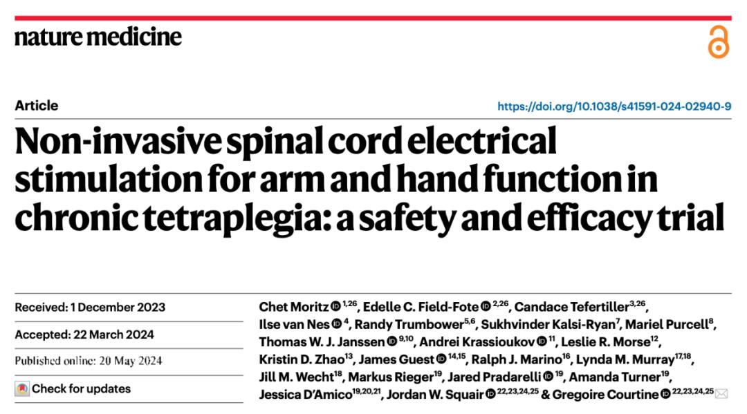 2024年5月20日,苏黎世联邦理工学院的 Gregoire Courtine 等人在 Nature Medicine 期刊发表了题为:Non-invasive spinal cord electrical stimulation for arm and hand function in chronic tetraplegia: a safety and efficacy trial 的论文。