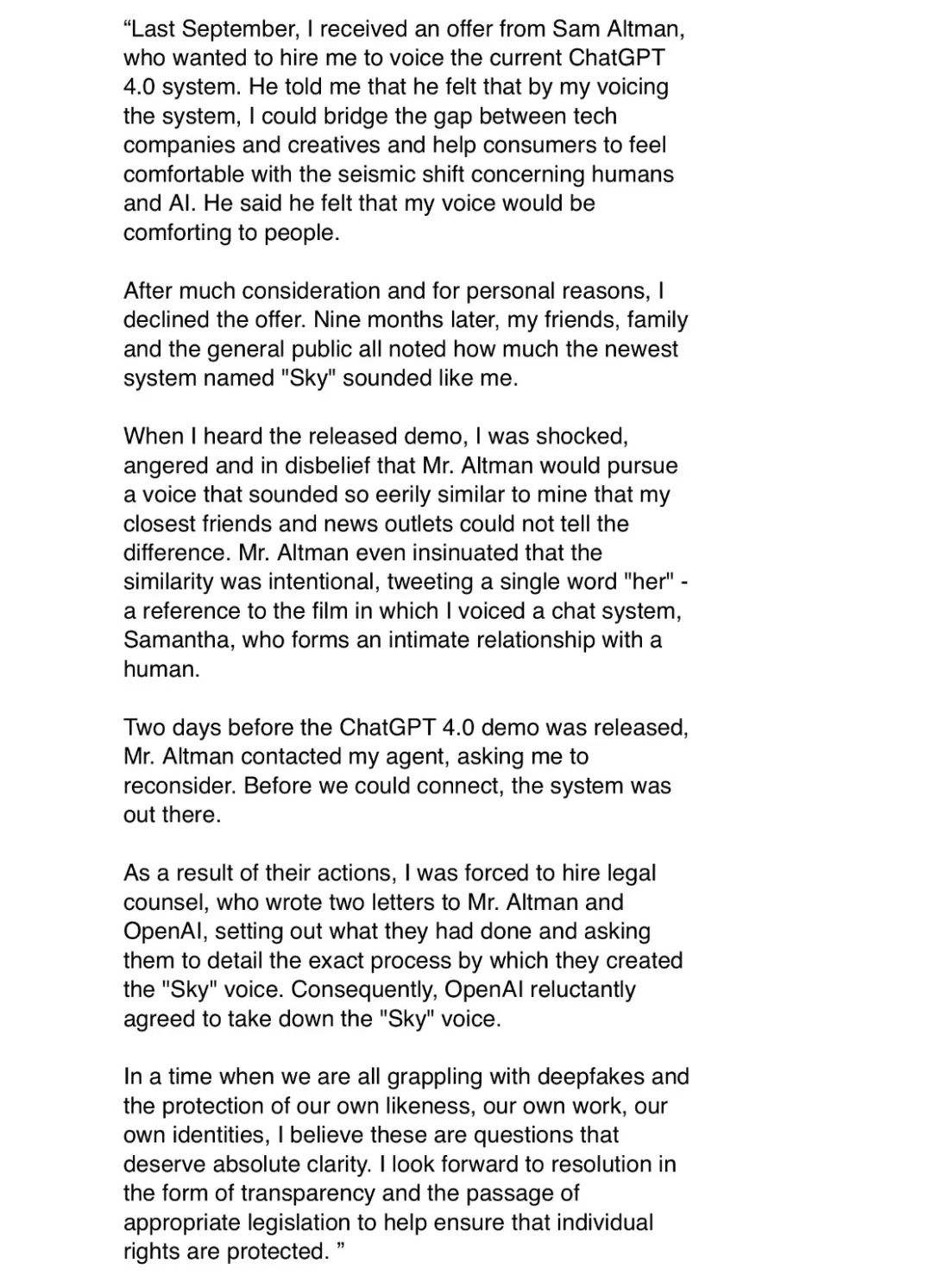 斯嘉丽在声明中概述了与Altman、OpenAI此前交涉的过程,并在结尾处呼吁要针对深度造假内容进行适当立法,确保个人权利得到保护。