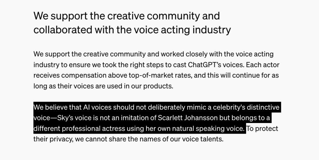 ▲斯嘉丽声明全文昨日晚间,OpenAI宣布撤下GPT-4o语音交互功能中的Sky声音,并用另一种名为Juniper的语音代替。OpenAI在声明中明确指出:“我们认为AI声音不应该刻意模仿名人独特的声音——Sky的声音不是模仿斯嘉丽·约翰逊,而是属于不同专业女演员使用她自己自然说话的声音。”