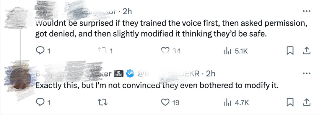 还有网友猜测,OpenAI先训练了类似斯嘉丽的声音,然后希望与她达成协议使用,遭到拒绝后进行了稍微修改。有网友甚至认为OpenAI可能都没有费心修改这一声音,而是直接进行了发布。