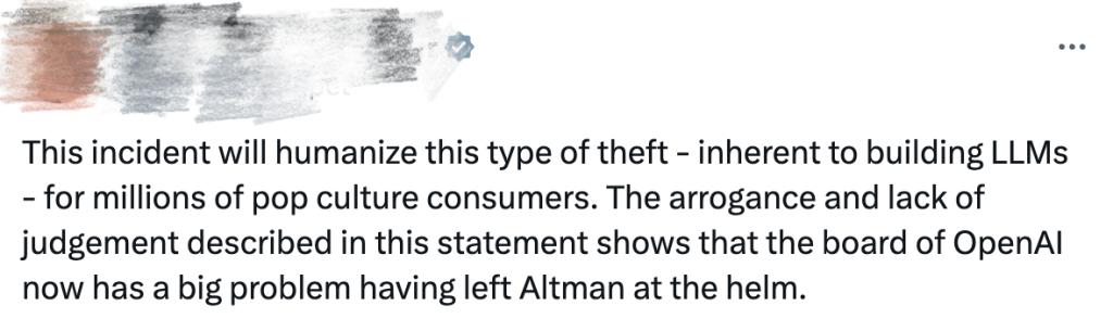 还有网友提到了Altman掌舵后对OpenAI的影响:“这份声明中所描述的傲慢和缺乏判断力表明,OpenAI董事会现在让Altman掌舵后遇到了大问题。”