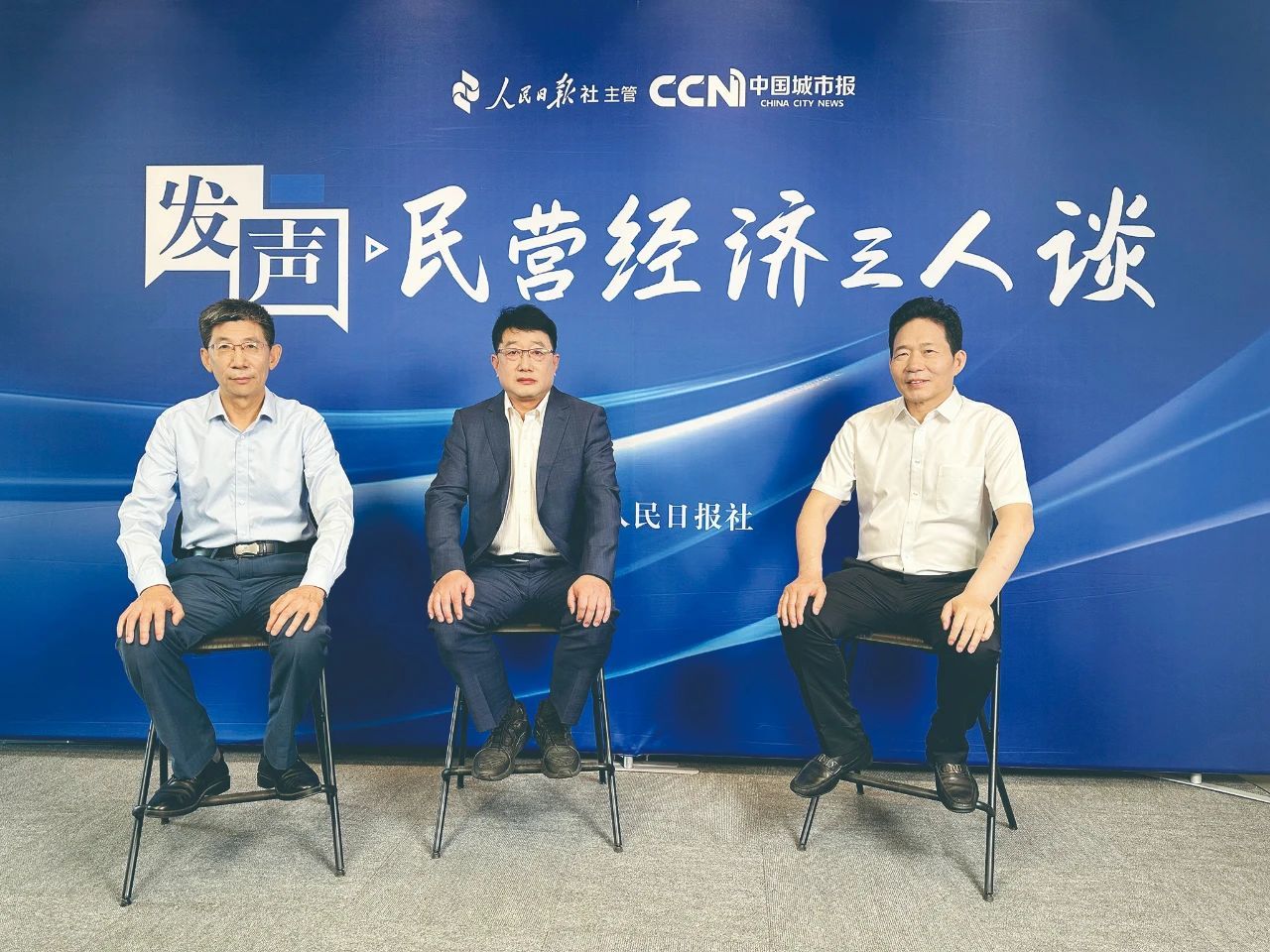张兴凯(左一)、连城(中)、董志龙围绕新质生产力和安全生产助力支持民营企业更好更快发展展开深入探讨。康克佳摄