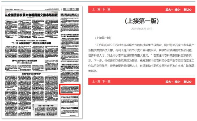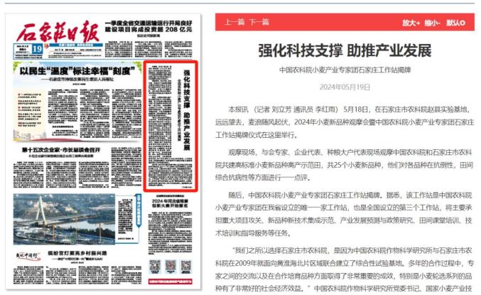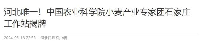 5月18日、19日,河北日报客户端、冀云客户端、《石家庄日报》对中国农业科学院小麦产业专家团石家庄工作站落户我县予以关注。详情如下: