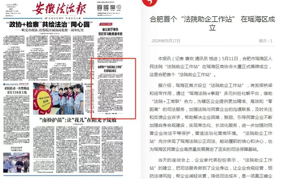 合肥市瑶海区人民法院向上滑动看下一个原标题:《《安徽法治报》头版报道我院全市首个“法院助企工作站”揭牌成立》