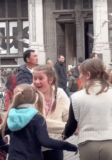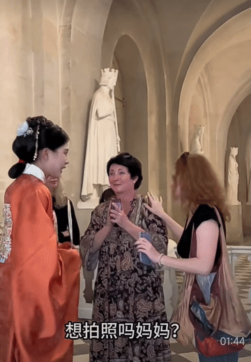 在巴黎凡尔赛,一位来自波兰的阿姨看到中国的传统服饰,激动的一直掉眼泪。当得知可以与哒哒拍照时,阿姨更是高兴得像个孩子,脸上绽放出灿烂的笑容。