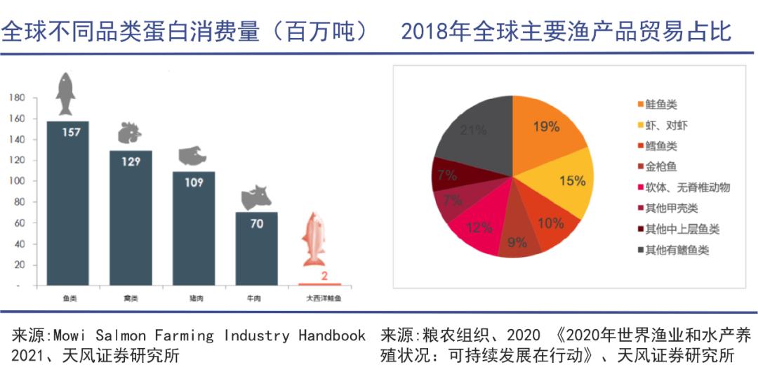 1999年起,全球人工饲养三文鱼开始超过野生捕捞,成为供给主力军。如今鲑鱼类(鲑鱼和鳟鱼)长期位列全球渔产品全球中最重要的品类,三文鱼更是多年位居首位。