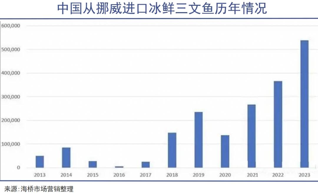 1986年,挪威水产商人别克·奥尔森来到日本推销三文鱼,并大获成功,2000年左右,挪威三文鱼进入中国市场。