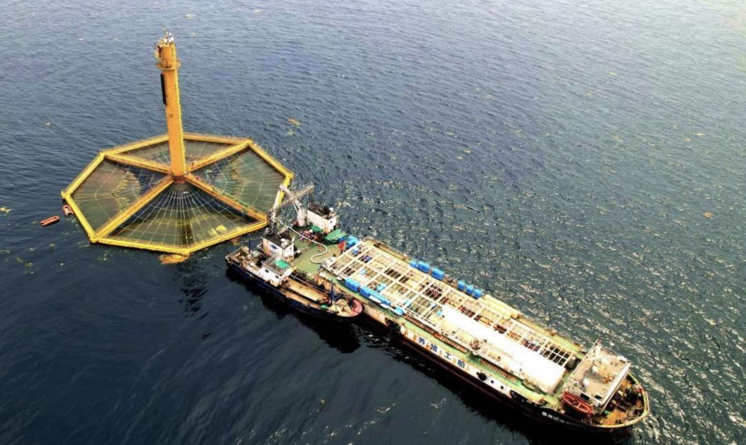 “深蓝一号”,来源:光明图片温暖海域成功养殖三文鱼,离不开“黄海冷水团”,三文鱼属于冷水鱼,我国利用“深蓝一号”网箱的独创沉浮设计,在冬季,让网箱浮在海水表层,到了夏季,就把网箱沉到冷水团,降低温度。