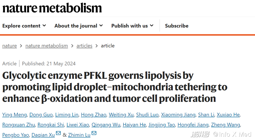 2024年5月21日,浙江大学转化医学研究院/浙江大学医学院附属第一医院/国家基础科学中心/浙江大学基础交叉研究院吕志民教授/许大千研究员团队在Nature Metabolism上在线发表了Glycolytic enzyme PFKL governs lipolysis by promoting lipid droplet–mitochondria tethering to enhance β-oxidation and tumor cell proliferation的文章,揭示了糖酵解酶PFKL通过其非经典功能-蛋白激酶功能,促进脂滴脂解的新机制。