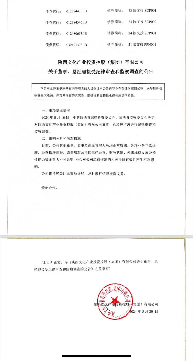陕西文化产业投资控股(集团)有限公司发布公告对外披露 ,卢涛于5月16日被调查。