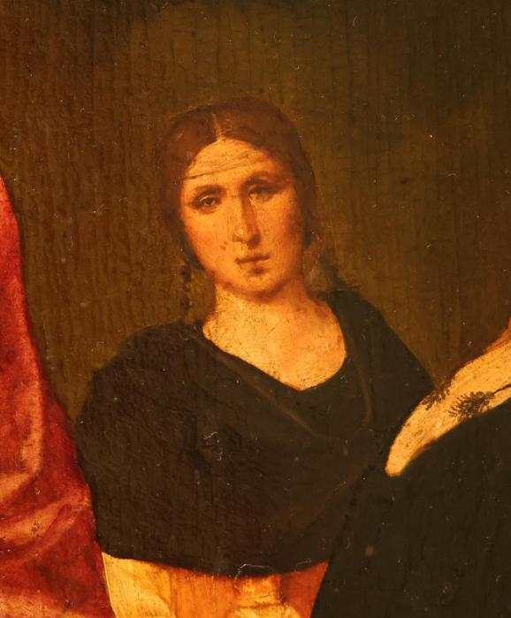 《摩西的考验》局部细节图结合故事梗概与手势、姿态传达的信息后,画家对人物的塑造便跃然纸上:智慧的老者正为摩西辩护,法老非但对他爱搭不理,反而让部下继续考验;两位侍从一位为摩西的选择而惊叹,一位抬头看向法老,却得到了法老继续执行的示意;身后的王公贵族们明明都见证了法老的残酷无情,却视而不见地望向别处。这幅画中的“灵魂角色”是那位歪头看向画外的女子——她仿佛就是画家本人的替身,仿佛是那位见证了一切并将其记录的人。她望着正在观画的人们,向观众讲述了这个遥远的故事。