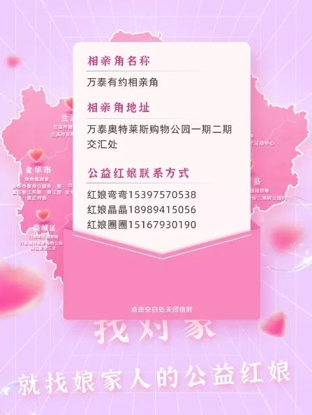“万泰有约”相亲角是婺城区妇联为解决当前社会青年婚恋难题、拓宽金华男女青年交友渠道、寻找婚恋对象搭建的固定公益平台,提供一站式公益红娘服务,宣传新型婚育文化,树立文明婚育观念。