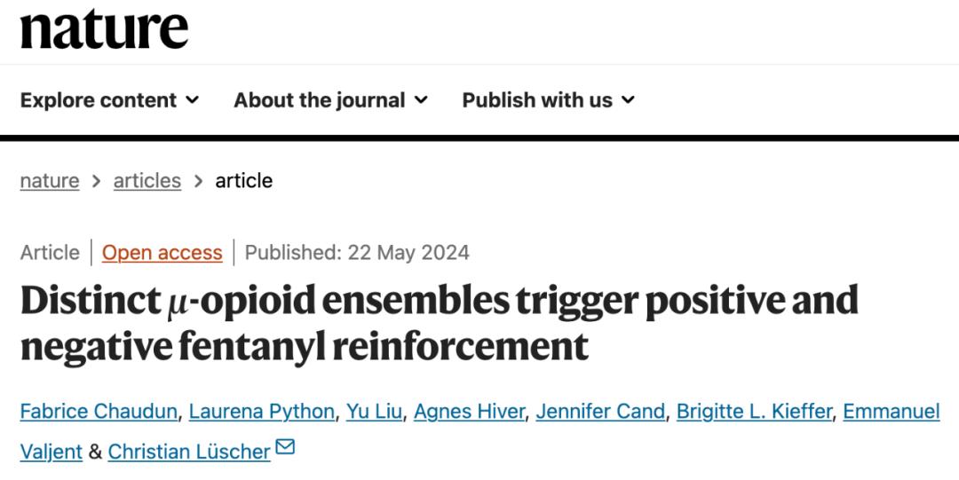 2024年5月22日,日内瓦大学的 Christian Lüscher 等人在 Nature 期刊发表了题为:Distinct µ-opioid ensembles trigger positive and negative fentanyl reinforcement 的研究论文。
