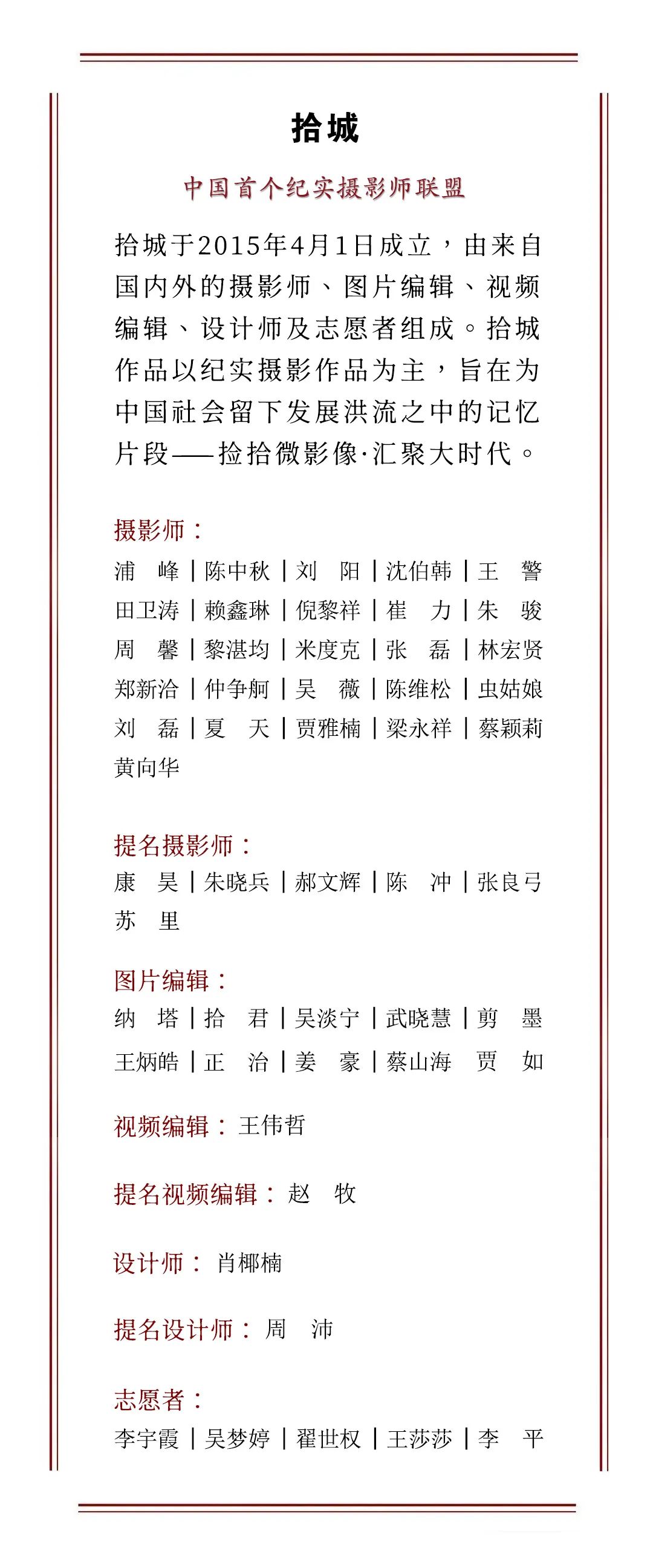 华章始于字词,拾城摄影师在不断精炼升华“字词”的过程中,从未停止过对“文章”的打造。拾城成员不仅有许多精彩的单幅照片,也都有自己多年关注的长线专题与许多阶段性的系列组图。作为一个摄影师团体,我们一直致力于展现摄影师及其作品,致力于让更多的好照片被人看见。捕捉吉光片羽也好,构建影像之城也好,都是对世界的图像描摹。拾城在探索了八年单幅之际,将开启我们的新阶段——开通专题栏目,我们取名为“拾集”。拾者,拾城、捡拾;集者,聚集、汇辑作品而成册。