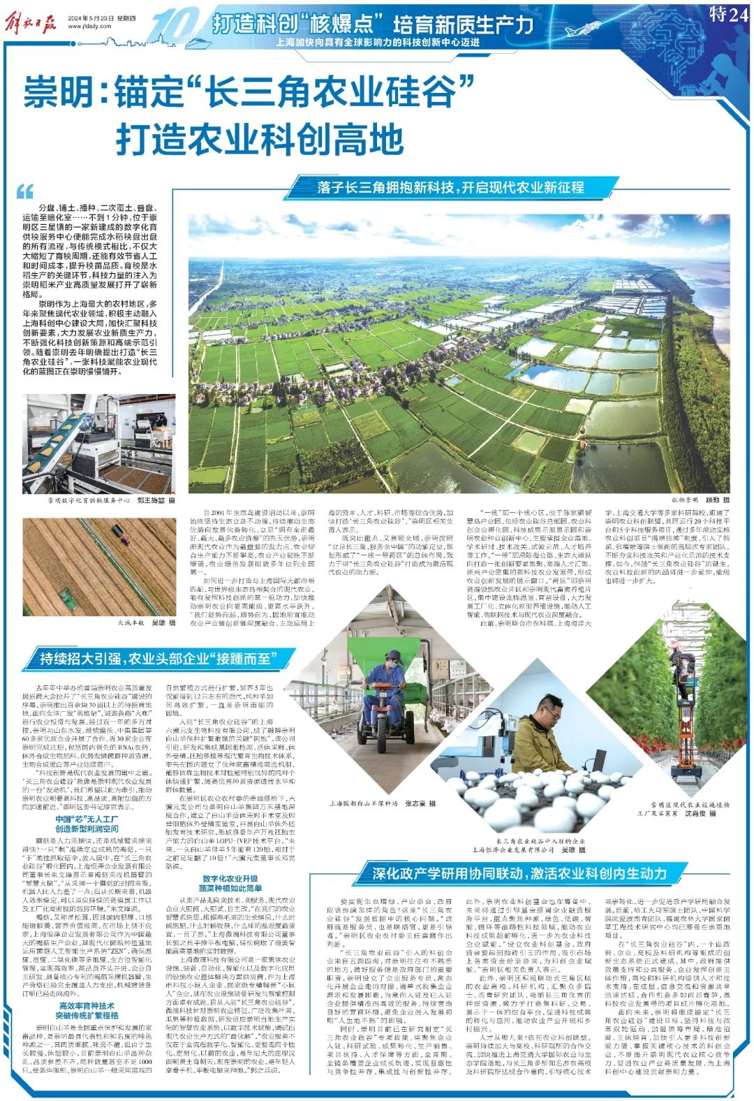 今天(5月23日),《解放日报》特24版“打造科创‘核爆点’ 培育新质生产力”,用一整个版面报道了崇明在发展现代化农业方面的积极探索,一起来详细了解一下吧!