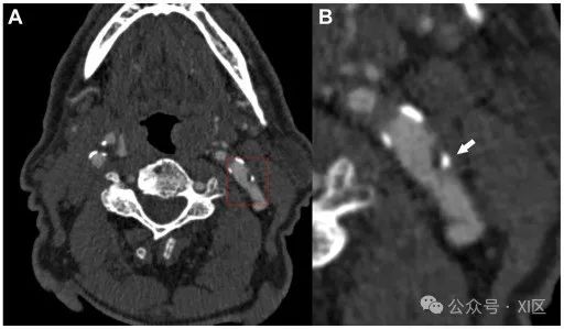 图2 在一名同侧缺血性卒中的82岁男性左侧颈动脉内观察到的腔内血栓。CT显示左侧颈动脉管腔内充盈缺损,表明存在血栓(A和B)。纤维帽破裂