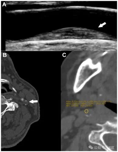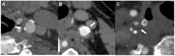 图4 CT显示的不同类型颈动脉钙化示例。(A)颈动脉斑块伴浅表钙化(白色箭头)。(B) 颈动脉斑块伴有大块钙化(白色箭头)。(C) 颈动脉斑块伴阳性边缘征(白色箭头)。颈动脉蹼
