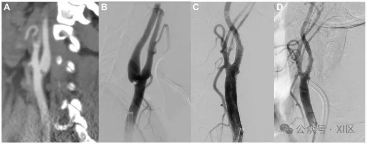 图5支架置入前后CT和DSA显示的颈动脉蹼示例。(A) CT扫描冠状切面上靠近分叉处的右颈内动脉蹼。(B) DSA前后切面显示分叉处的颈动脉蹼充盈缺损和湍流。(C和D)前正位(C)和侧位(D)切面上支架置入后的右颈动脉。未来方向
