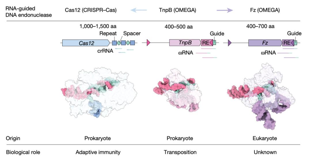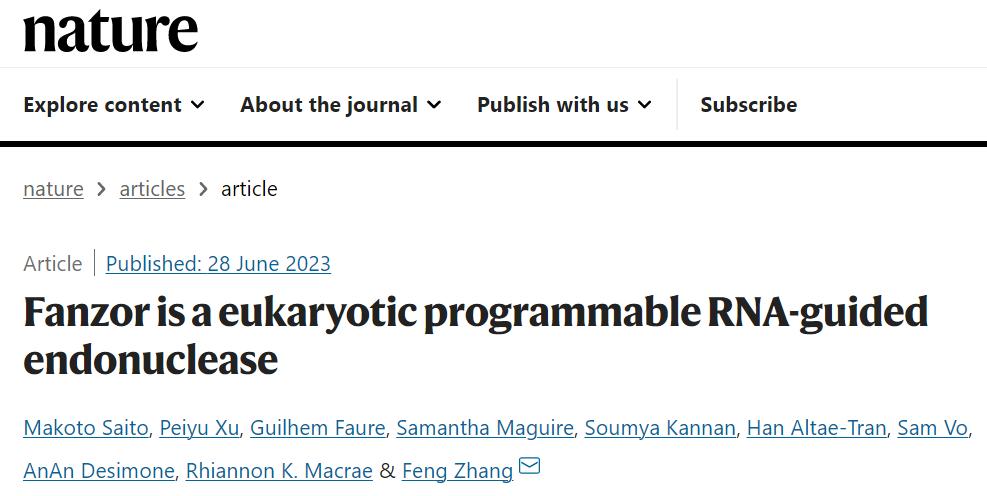 2023年6月28日,张锋团队在 Nature 期刊发表论文【2】,在真核生物中发现了第一个RNA引导的DNA切割酶——Fanzor,更重要的是,这种新型CRISPR样系统,可以在重编程后实现对人类基因组的编辑。此外,相比CRISPR-Cas系统,Fanzor系统非常紧凑,更容易递送到细胞和组织中。而且,Fanzor系统没有旁系切割活性,可实现更精准的基因组编辑。