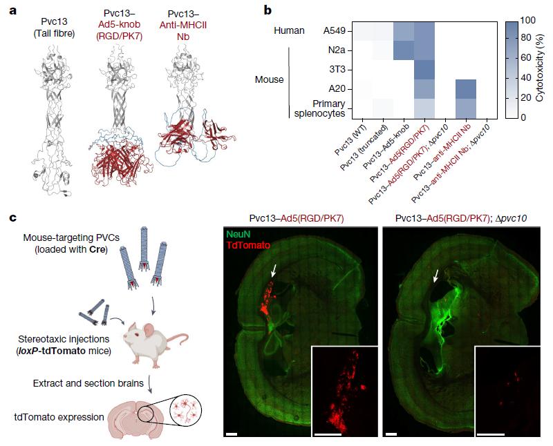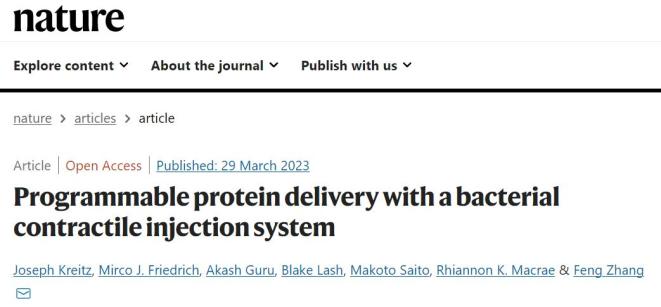 2023年3月29日,张锋团队在 Natrue 期刊发表论文【3】,通过AlphaFold辅助蛋白质设计,改造、利用独特的细菌“注射器”——细胞外可收缩注射系统(eCIS),将蛋白质注射到人类细胞中,从而开发出了一种蛋白质递送系统。