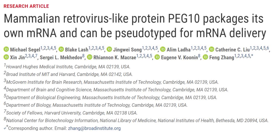 2021年8月,张锋教授团队在 Science 期刊发表论文【4】。该研究开发了一种全新的RNA递送平台——SEND,SEND的核心是逆转录病毒样蛋白PEG10,它能够与自身的mRNA结合并在其周围形成球型保护囊。张锋团队将PEG10改造设计后用来包装和递送RNA。