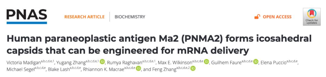 此外,2024年3月,张锋教授团队在《美国国家科学院院刊》(PNAS)发表论文【5】。该研究开发了一种基于人类PNMA2蛋白的mRNA递送方式,PNMA2蛋白可在人类细胞中自然形成二十面体的病毒样衣壳,工程改造的PNMA2变体(ePNMA2),可以在体外封装mRNA并将其递送到宿主细胞。