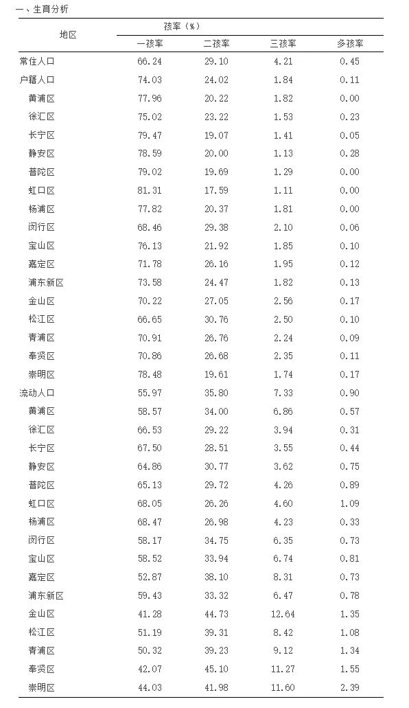 《上海市2022年度人口监测统计数据》显示,上海常住人口一孩率为66.01%,二孩率为29.46%,多孩率为4.53%。户籍人口一孩率为73.80%,二孩率为24.34%,多孩率为1.86%。