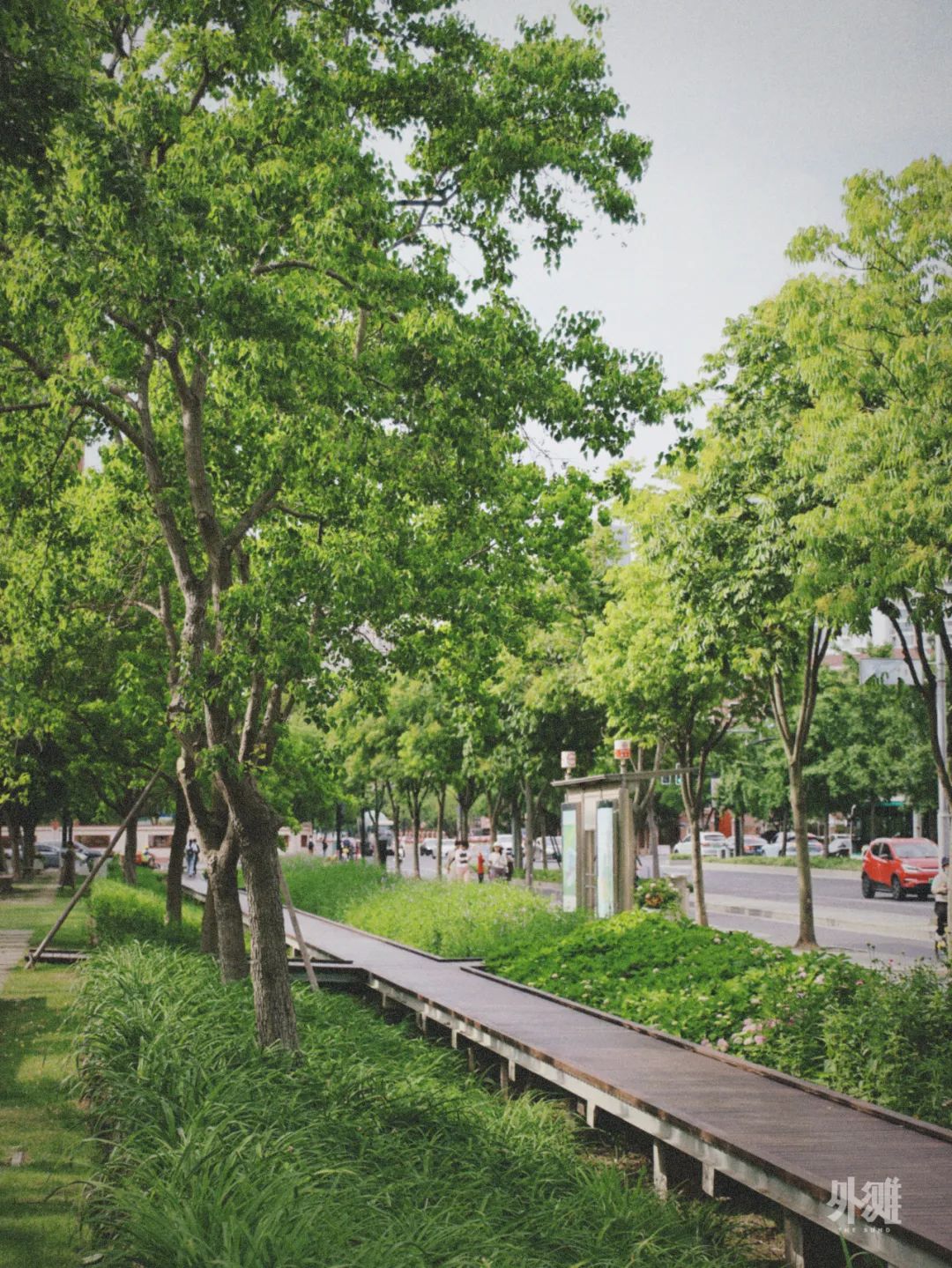 在这直线型的公园里,雨水花园系统覆盖了超过一半的长度。它的功能是能让道路雨水通过植物和土壤的过滤渗透,净化后再流进附近的小河浜,汇聚到黄浦江里。