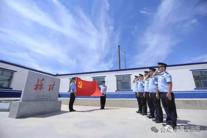 ▲图片来源:内蒙古画报 算井子边境派出所民警重温入党誓词“国旗升起在哪里,家就在哪里”。尼玛母子50多年累计巡逻18万多公里,被誉为边境线上“活界碑”。