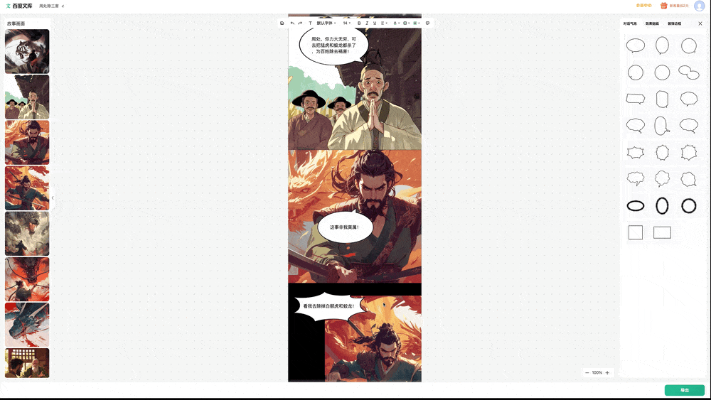 AI生成漫画作品用的时间要比生成画本久一些,默认会生成连续的多图条漫,并自动匹配人物对话文本。创作完成后,用户就可以在百度文库智能漫画编辑器里浏览完整漫画,而且可以随意拖拽挪动对话框的位置、修改对话框里的文本。