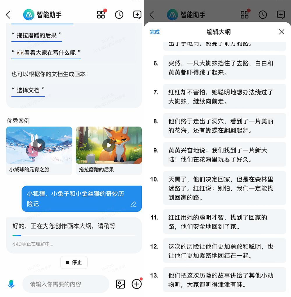 比如输入主题“小狐狸、小兔子和小金丝猴的奇妙历险记”,等待十几秒,百度文库就会根据对主题的理解创作出一份画本大纲。