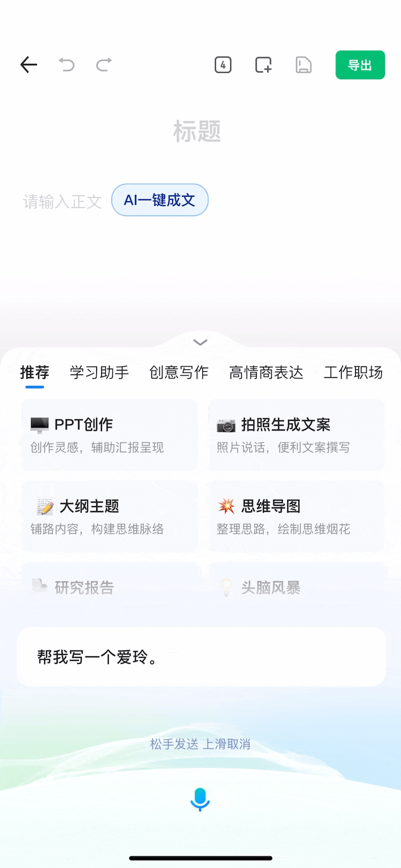 用户只需说出简单的语音指令,就能迅速生成结构完整、内容权威的报告,而且可以用语音对文档直接进行排版调整、内容细节优化、数据图表制作等操作,多文档智能合成也不在话下。