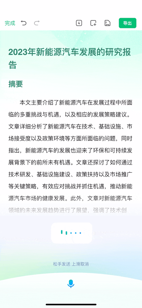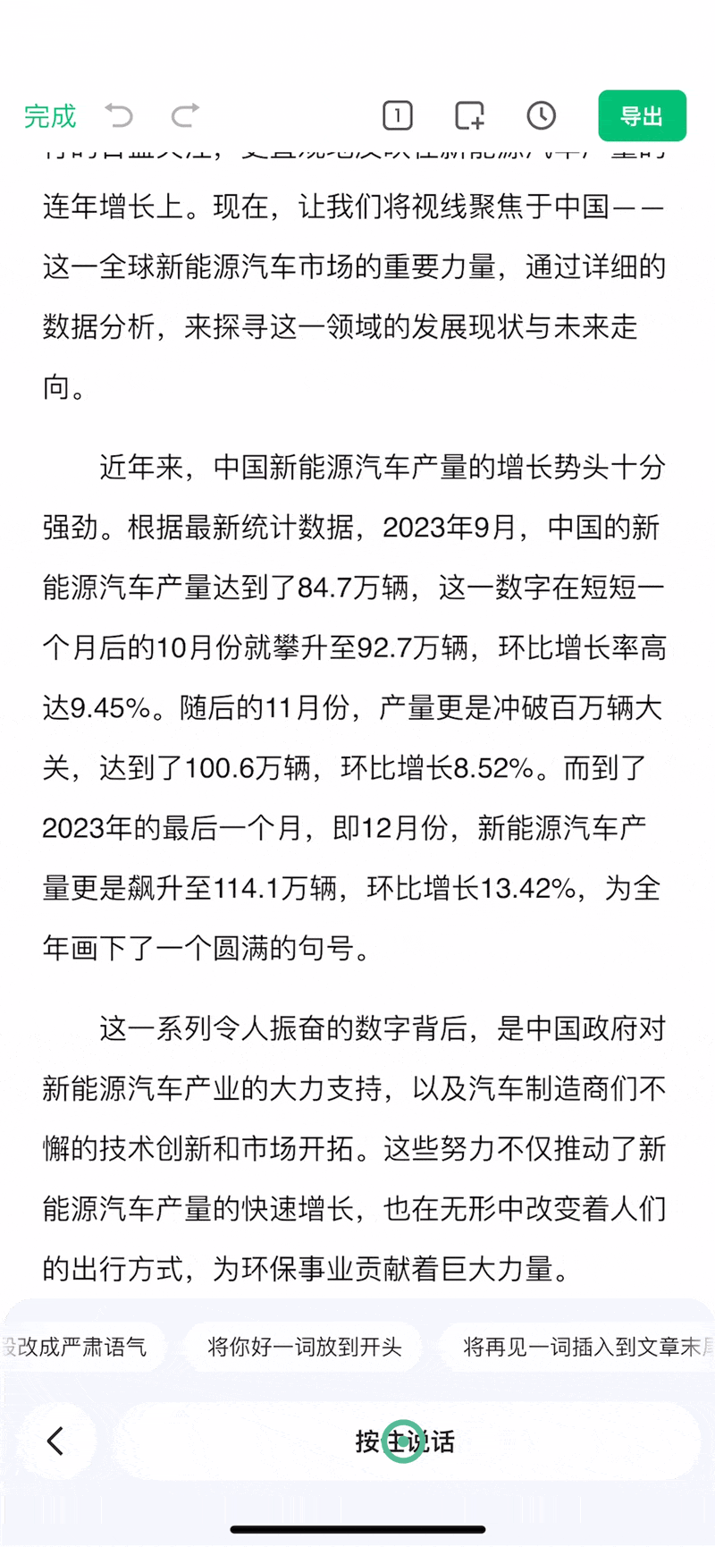 比如语音输入“帮我写一个2023年新能源汽车发展的研究报告”,AI写大纲的速度飞快,随即生成一份有4万多字的研究报告,图文并茂。
